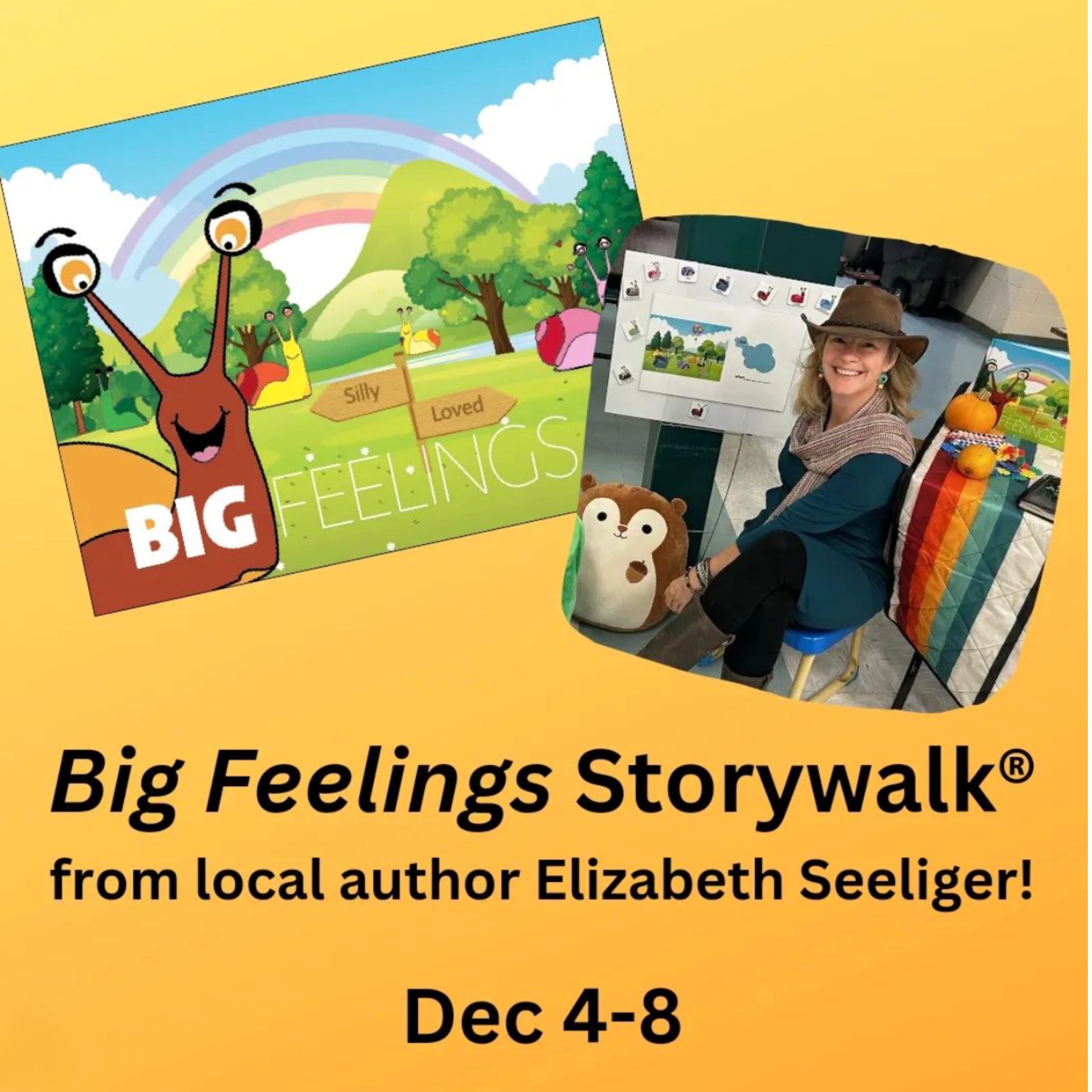 Local author Elizabeth Seeliger, who is CEDAR Center's board president, collaborated with me to produce an interactive StoryWalk® featuring the "Big Feelings" book that she wrote with her daughter. She will be our featured storyteller at our Dec. 6th music event, and the StoryWalk® will be set up at the Mount Horeb Public Library Dec. 4-8th.