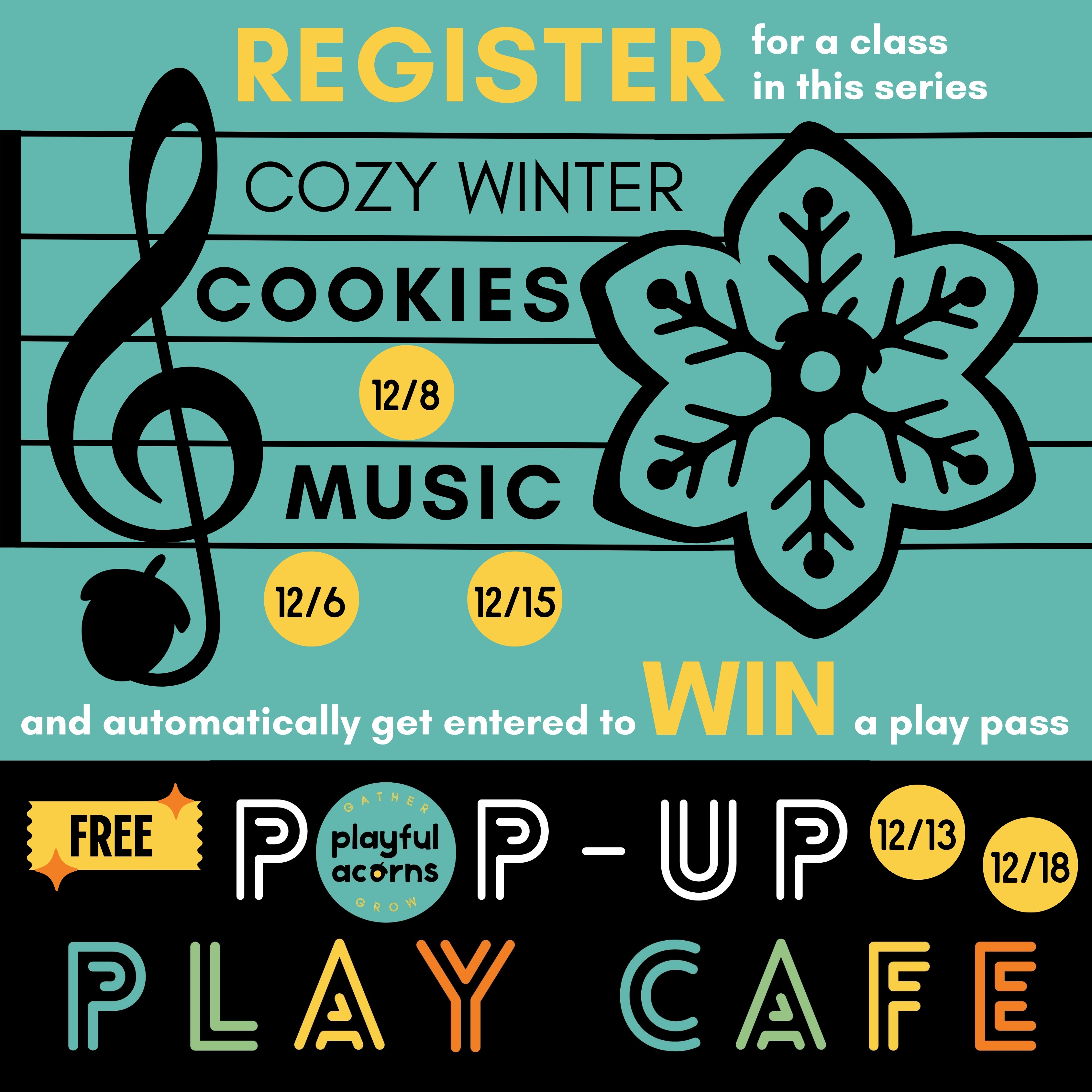 Here’s all you need to do to participate! Register for a class (or more than one for additional entries) in our Cozy Winter Cookies, Songs, and Stories series and you’ll be automatically entered to win a free pass to one of our upcoming Playful Acorns Pop-Up Play Cafe events*! All programs are for caregivers and kids (geared toward ages 0-5) and prices include one adult + one child unless otherwise noted.