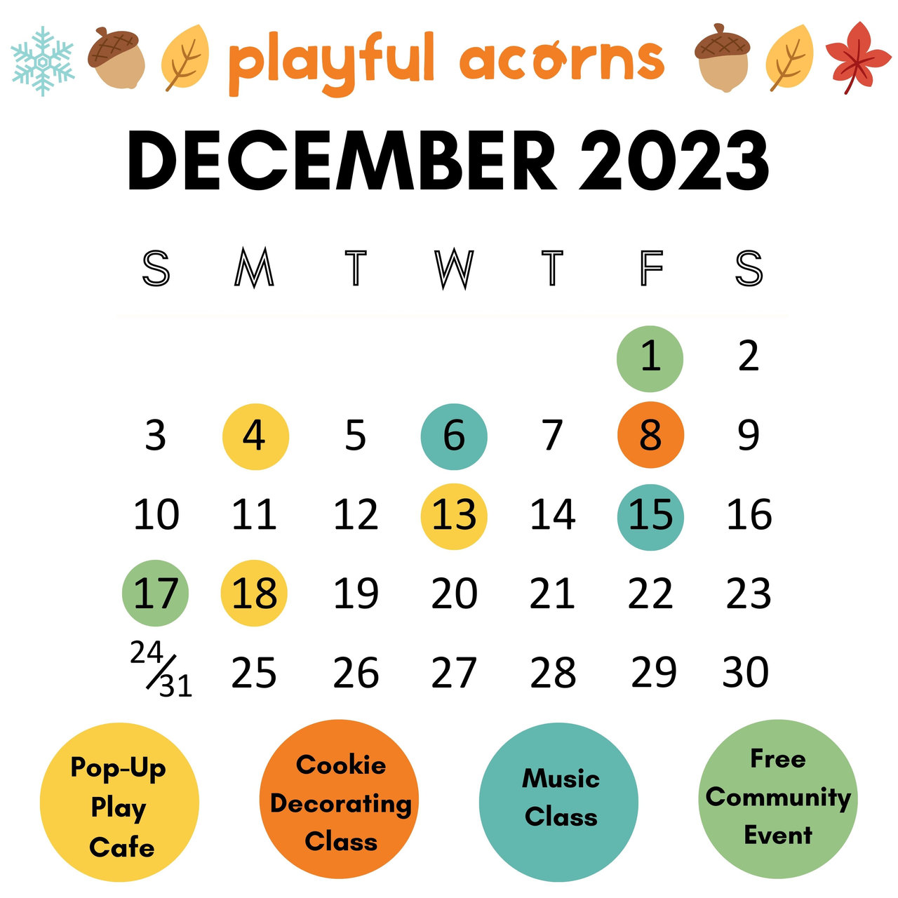 Here's a glimpse of our exciting December schedule with Playful Acorns Pop-Up Play Cafe offerings, collaborative music and cookie decorating classes, and free community events. As an email subscriber, you are among the first to know about these programs. All events are geared toward caregivers and their kids (ages 0-5) unless otherwise noted. Please note that some event registration is through our partner websites (linked in the descriptions), and prices generally include 1 adult + 1 child (a portion of proceeds go to local nonprofits). We encourage you to share with your friends. Hope to see you soon!