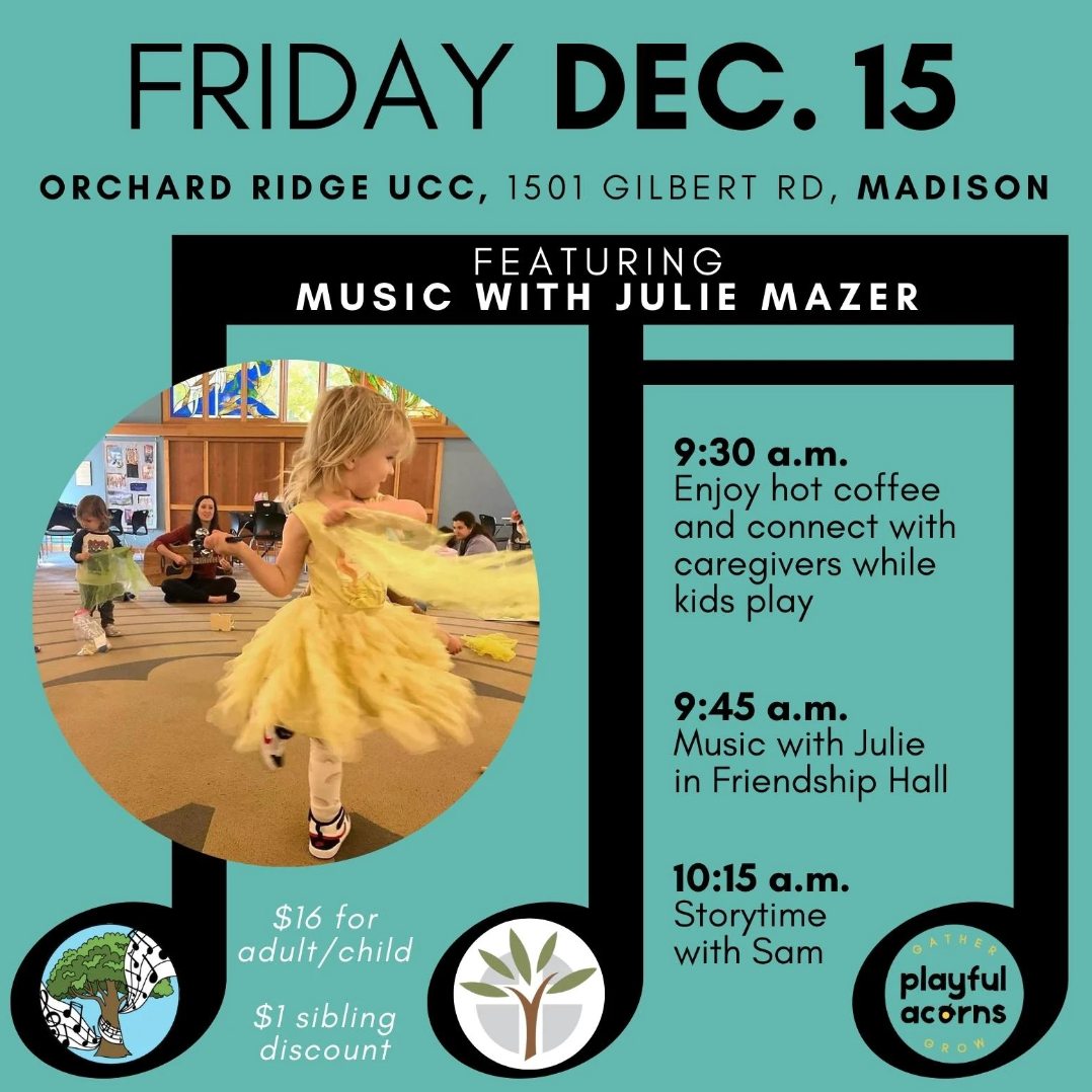 Join Music with Julie Mazer from 9:30-10:30 a.m. Friday, Dec. 15th for music class at 1501 Gilbert Rd, Madison. At 9:30 a.m., enjoy free coffee and connect with caregivers while kids play. We’ll meet in Friendship Hall (inside Orchard Ridge UCC, an open and affirming church) for music at 9:45 a.m. and storytime at 10:15 a.m.