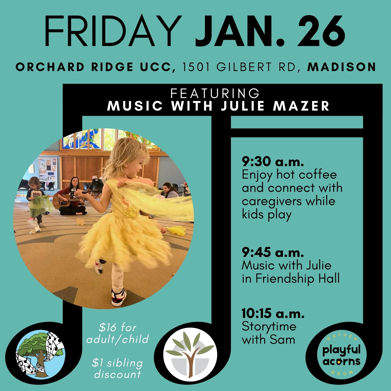 Jan. 26 (Friday from 9:30-10:30 a.m.): Join us for a morning of music with Julie Mazer, stories, and fun! Caregivers can connect over hot coffee while their kids (ages 0-5) play before and after class at Orchard Ridge UCC, 1501 Gilbert Rd, Madison. ($16 for adult/child — older siblings welcome - Registration requested by 1/25)