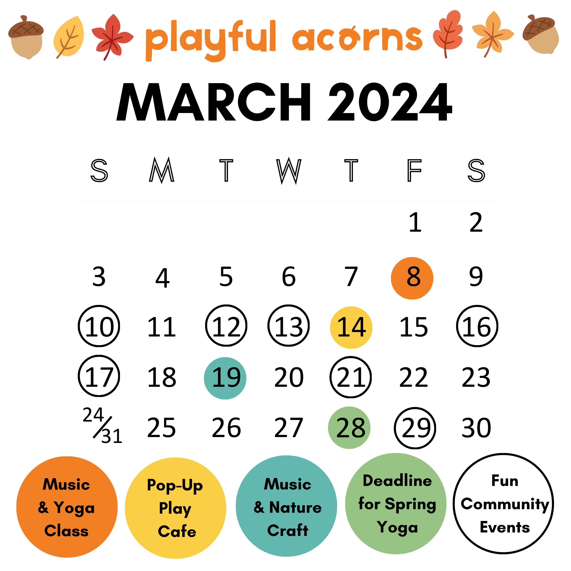We’re two weeks away from the official start of spring, and we can’t wait to offer more nature-based programming! As we transition to warmer weather, we’ll still be easing into the outdoors by holding classes indoors close to parks and trails. This month’s Playful Acorns events include two different music classes (one paired with a yoga class and another featuring a nature craft) and our last Lil’ Explorer Play Cafe for the season at the Lussier Family Heritage Center since it will soon be the hub for spring and summer educational programs and camps. Hope to see you there!