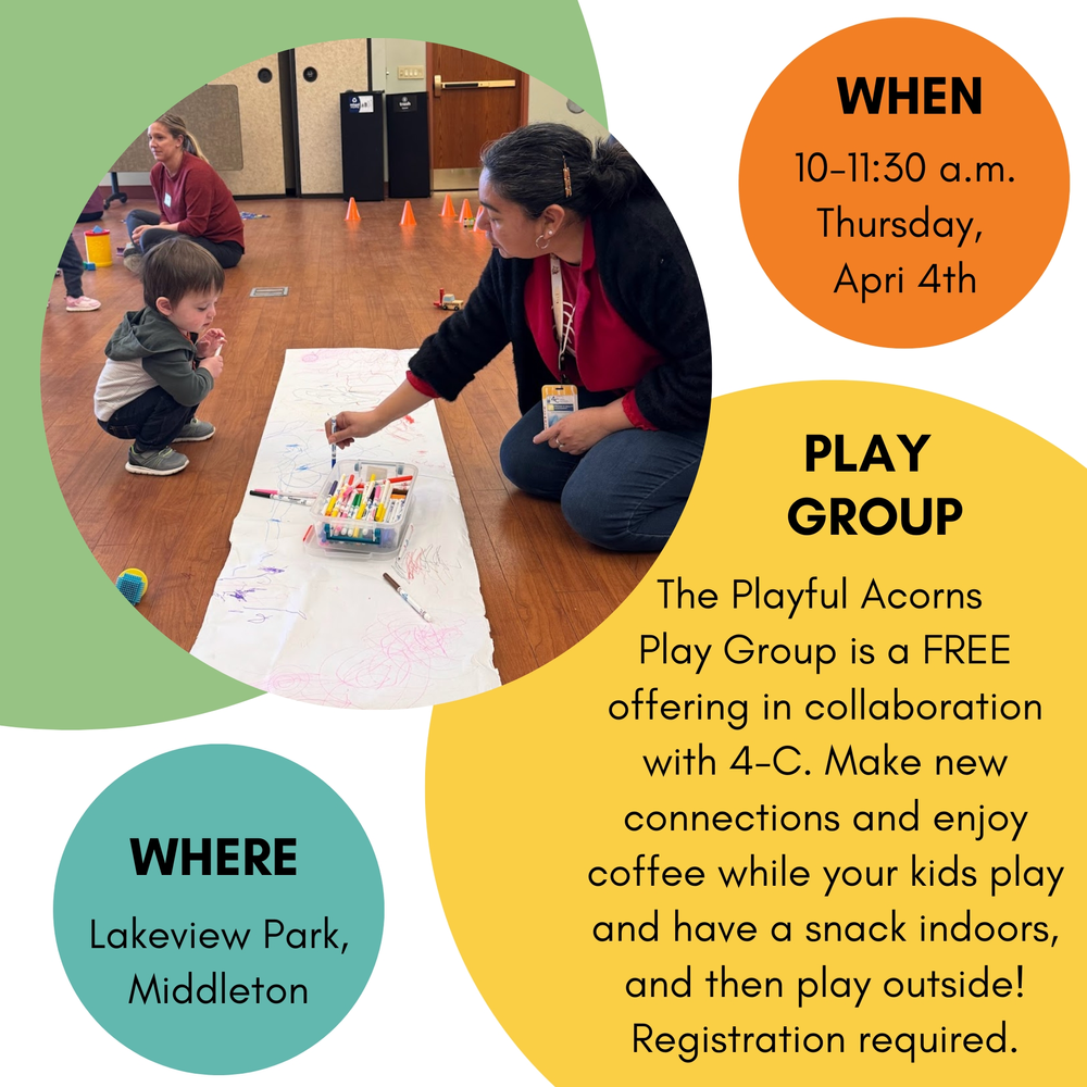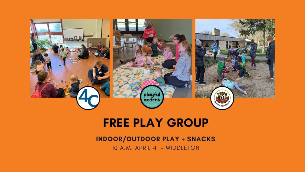 - Free Play Group: 10-11:30 a.m. Thursday, April 4th at Lakeview Park indoor heated shelter, Middleton (space limited, registration required)
