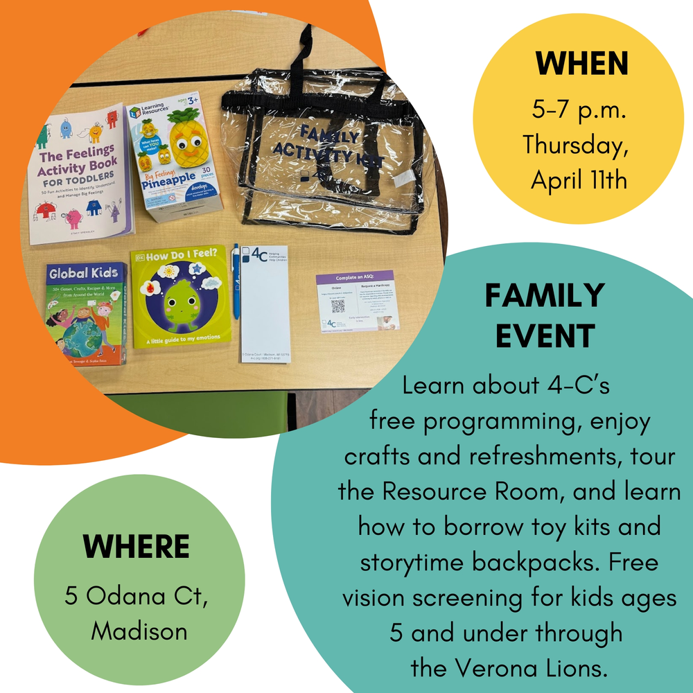 - Free Family Event: 5-7 p.m. Thursday, April 11th at 4-C's building, 5 Odana Ct, Madison (crafts, refreshments, tour Resource Room, learn how to borrow toy kits and storytime backpacks, get a free vision screening. Learn more at 4-c.org and in their latest e-news)