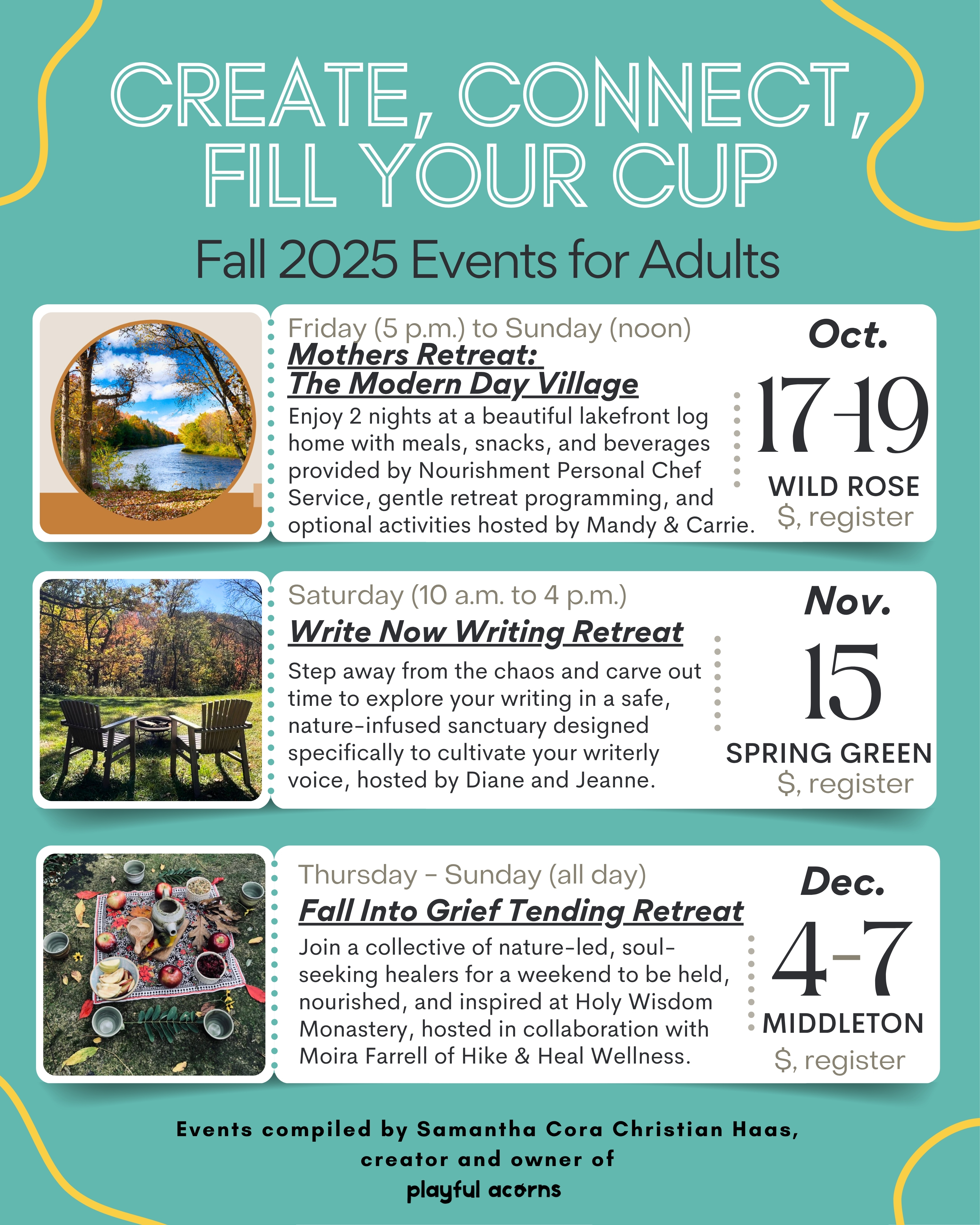 - Trail Tuesday on the Ice Age Trail led by Leslie from LC Babywearing. Leslie is holding free events each Tuesday at 9 a.m., and I’ll be joining her for an optional photo add-on with you and your kiddo on Oct. 28 at the Valley View Segment. (Free to attend, $30 optional photo add-on with a portion of proceeds supporting the Ice Age Trail Alliance).