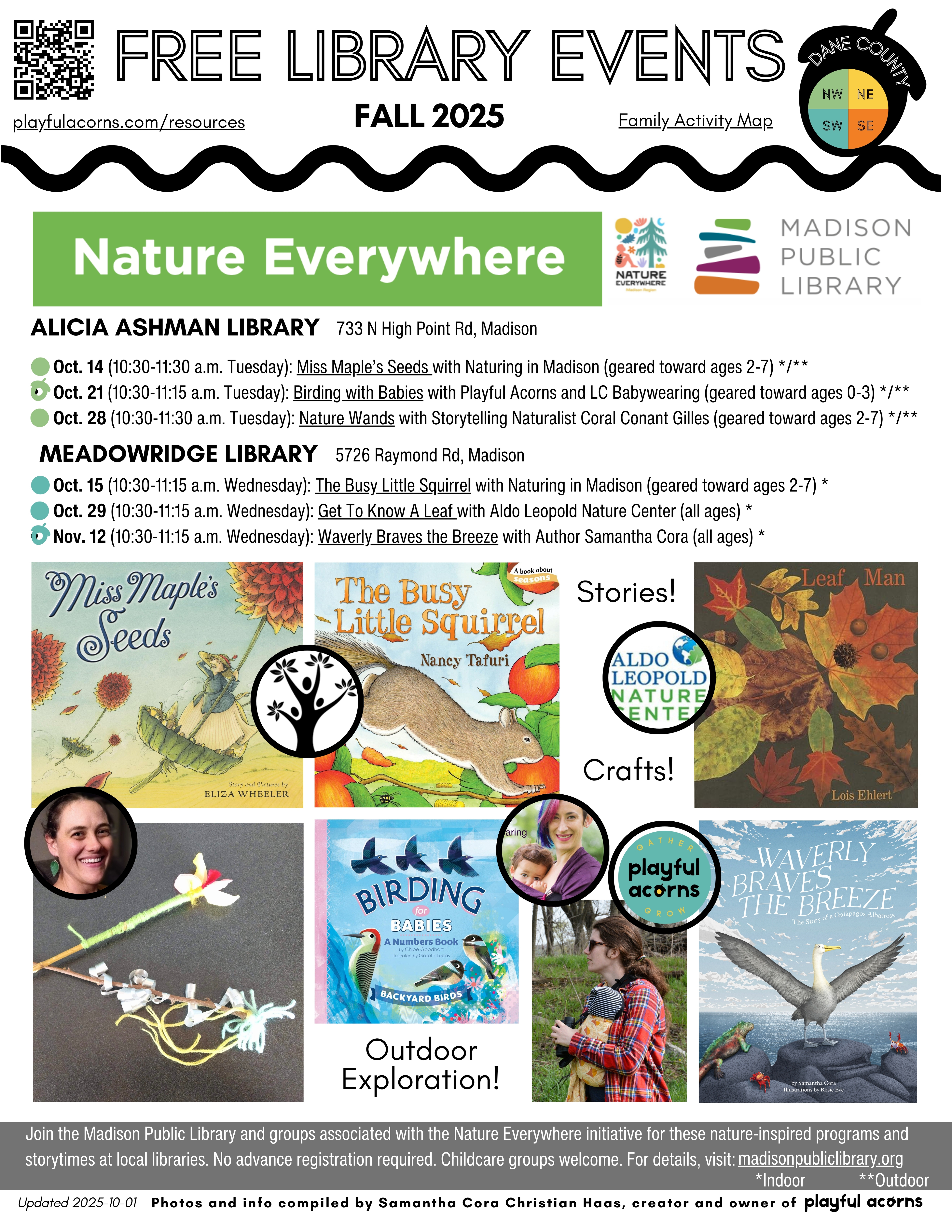 A special thank you to Madison Public Library, Autumn DeMet with Nature Everywhere and Aldo Leopold Nature Center, Christie Moser with Naturing in Madison, Storytelling Naturalist Coral Conant Gilles, and Leslie Cao from LC Babywearing! You can view all the details for these free events here!