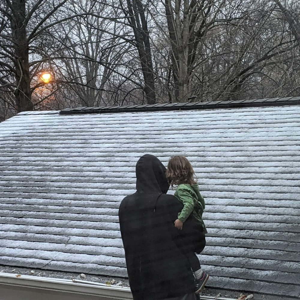 Nov. 21st: Before daycare dropoff today, our daughter got a glimpse of slushy snow on the grass, leaves, and our garage. An hour later, it had melted.
