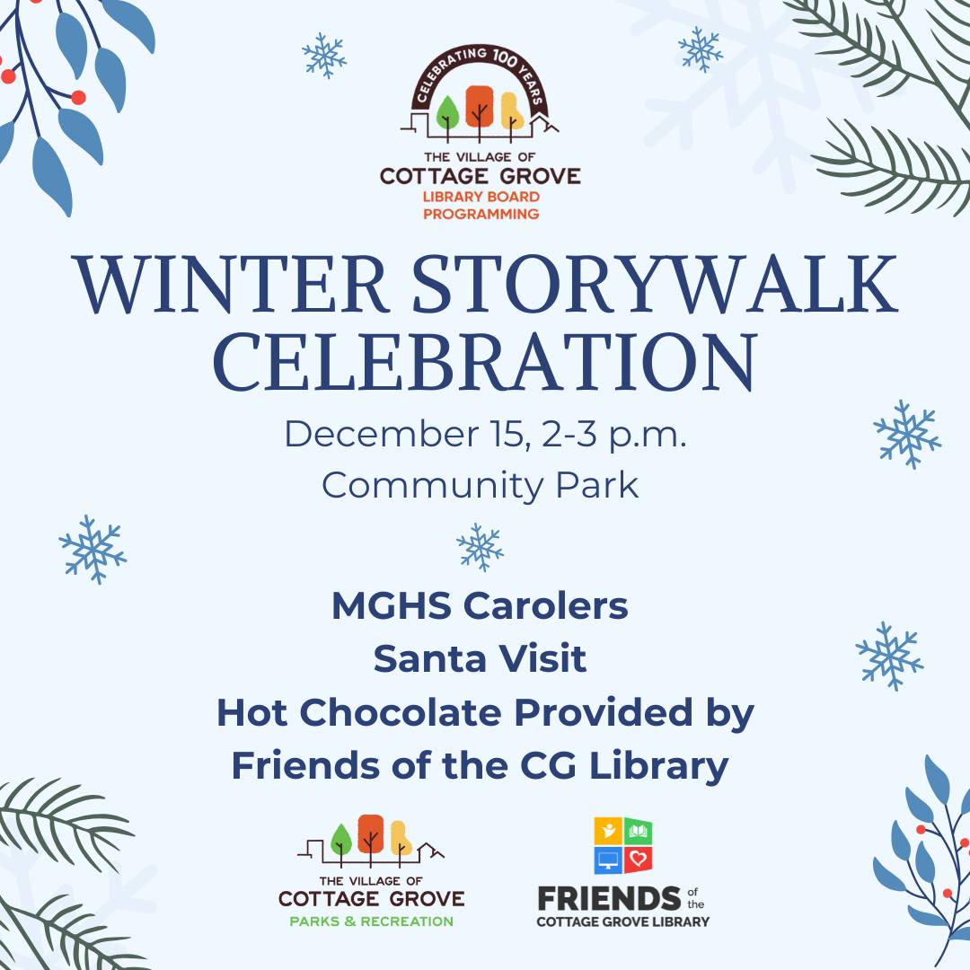 In 2024, the Village of Cottage Grove Library Board & Parks Department collaborated to bring the first permanent StoryWalk to their community! At 2 p.m. Sunday, December 15th, join them by celebrating the StoryWalk and spread some holiday cheer at Community Park in Cottage Grove.