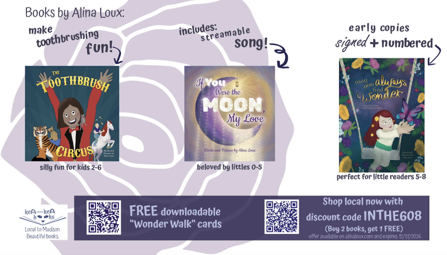 Through December, the book launch celebrates shopping small and supporting local businesses. The book is available exclusively on the author’s website (www.alinaloux.com) and at these beloved local bookstores: Kismet Books (Verona), Ink Cap Books (Stoughton), and Lake City Books (Madison). Each copy is marked as an early copy, signed, and numbered to thank you for shopping small.