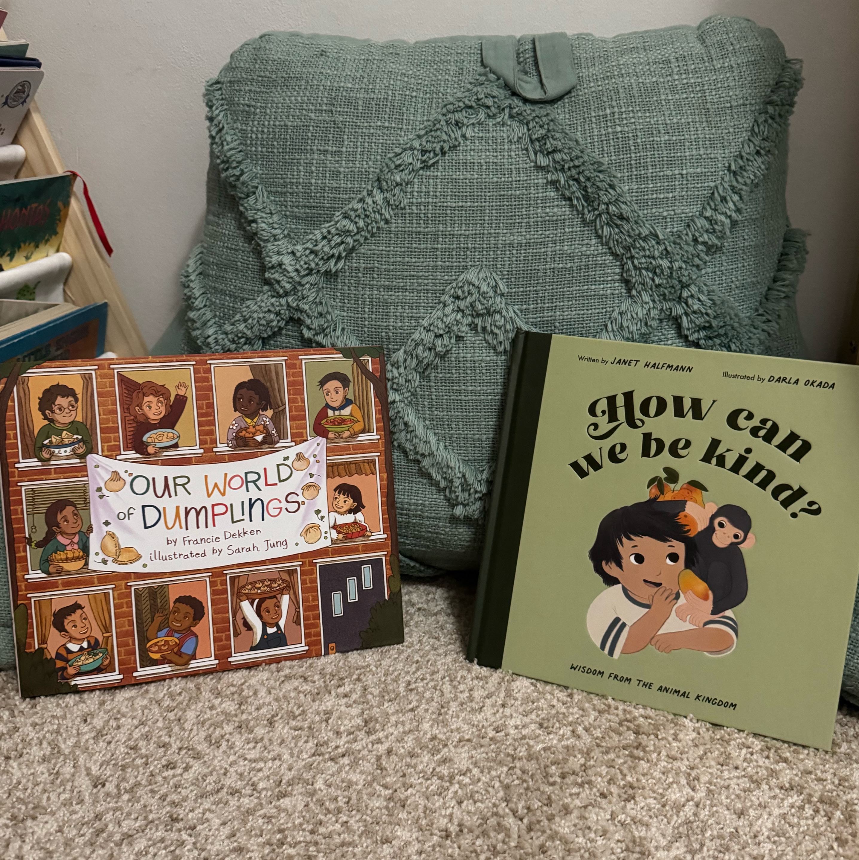 At left: New additions to my collection from the WEMTA Author Fair ("Our World of Dumplings" by Francie Dekker and "How Can We Be Kind" by Janet Halfmann). At right: Some of my favorites for springtime that I brought along to a recent Playful Acorns program ("Birds" by Kevin Henkes and "Every Little Seed" by Cynthia Schumerth.