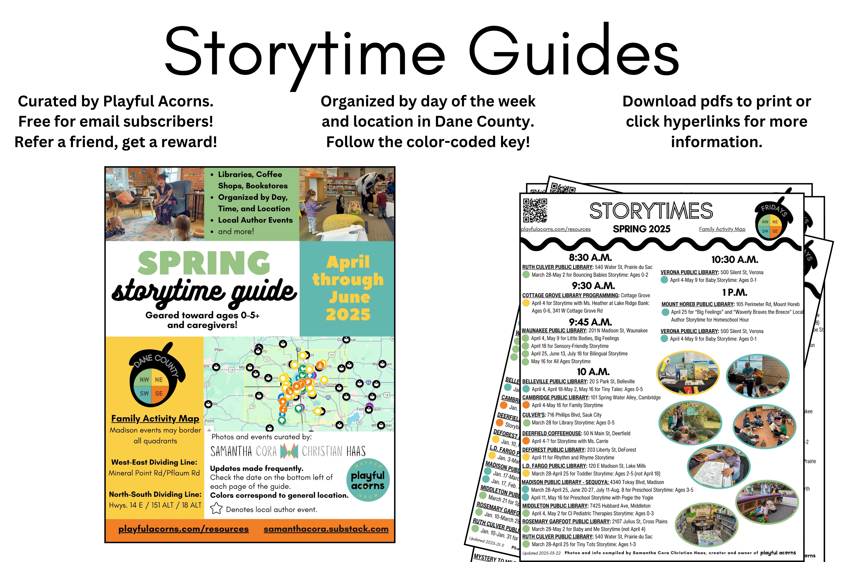 I’m excited to release the Spring Storytime Guide, a comprehensive look at storytimes in and around Dane County, WI from April-June 2025. The guide is organized by day of the week, start time, and location. Learn more below!
