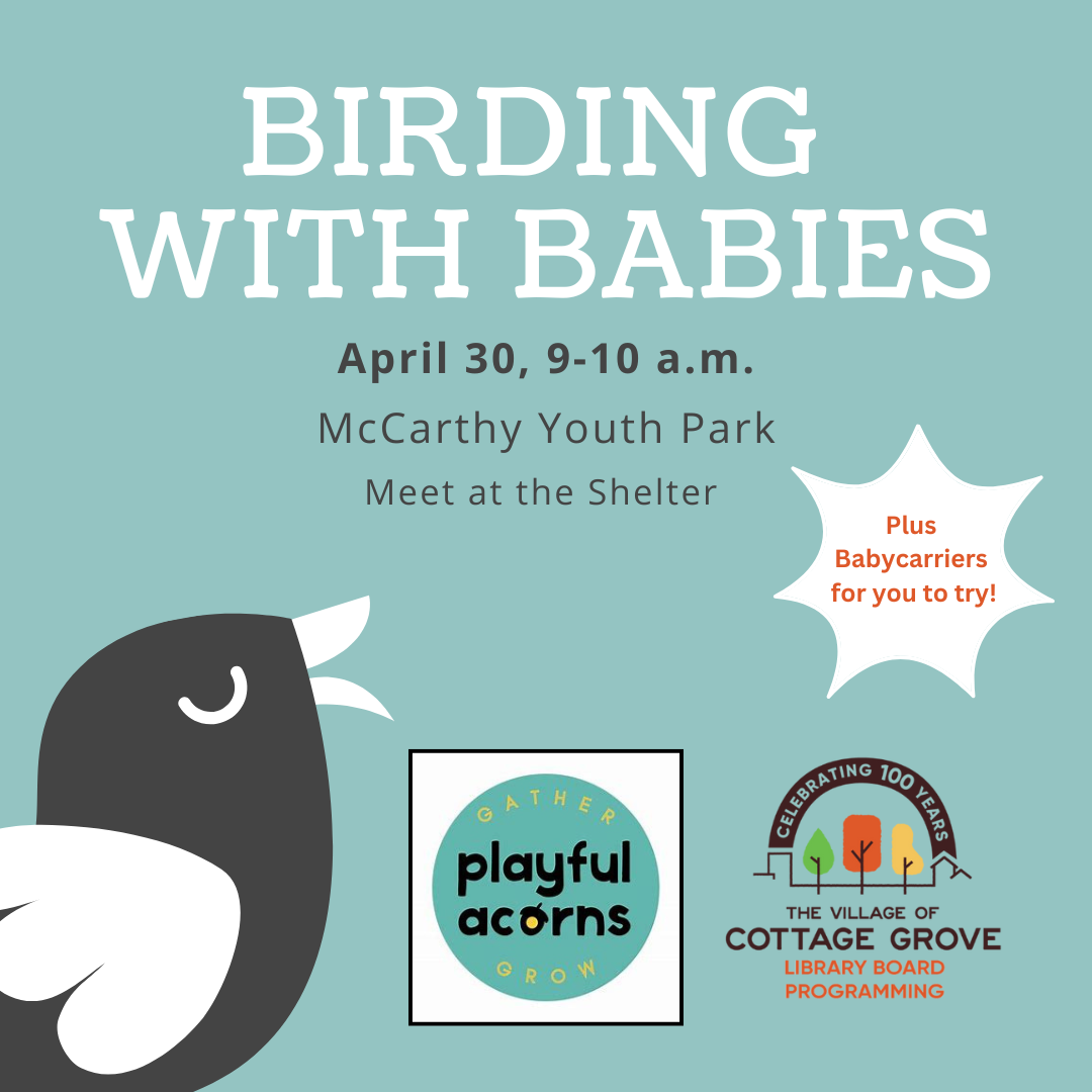 *~April 30 (Wednesday from 9-10 a.m.): Birding with Babies storytime with Samantha Cora and guided hike with Playful Acorns, LC Babywearing, and Village of Cottage Grove Library Board (geared toward ages 0-2 with caregiver, all ages welcome), McCarthy Youth & Conservation County Park, Cottage Grove.