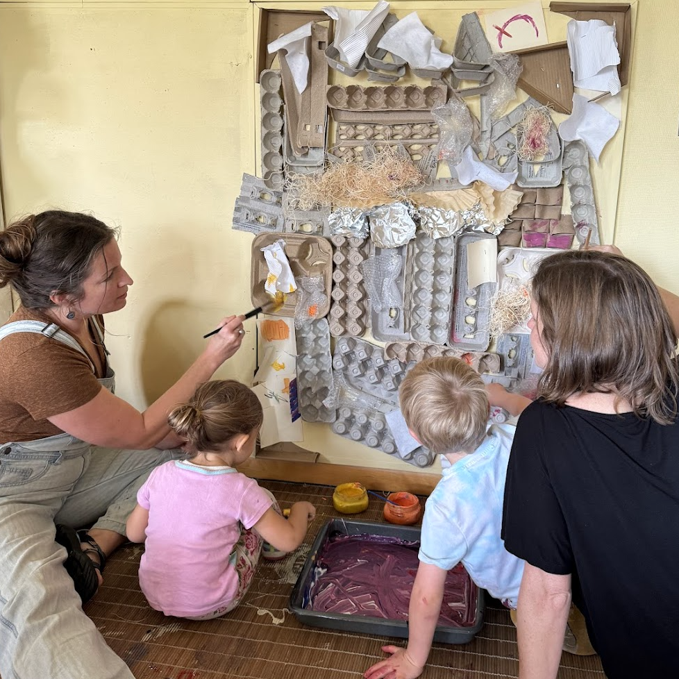 Yesterday, Z and I attended the first session of the Tinkering Tots art class for toddlers/preschoolers (roughly ages 2-4) and their caregivers with Carrie from Kindling Community Arts at the Eastmorland Community Center. The room is a beautiful, light-filled space with endless opportunities for process art and open-ended creativity. We enjoyed hearing a story, playing with sand, amethyst crystals, and fairy homes, and painting using bright colors and marigolds, as well as contributing to a collaborative art project with egg cartons, bubblewrap, and other household materials. To accommodate naptimes, Carrie will now be offering the class as a drop-in anytime between 1:30-4 p.m. Fridays through Nov. 15th. ($10/class)
