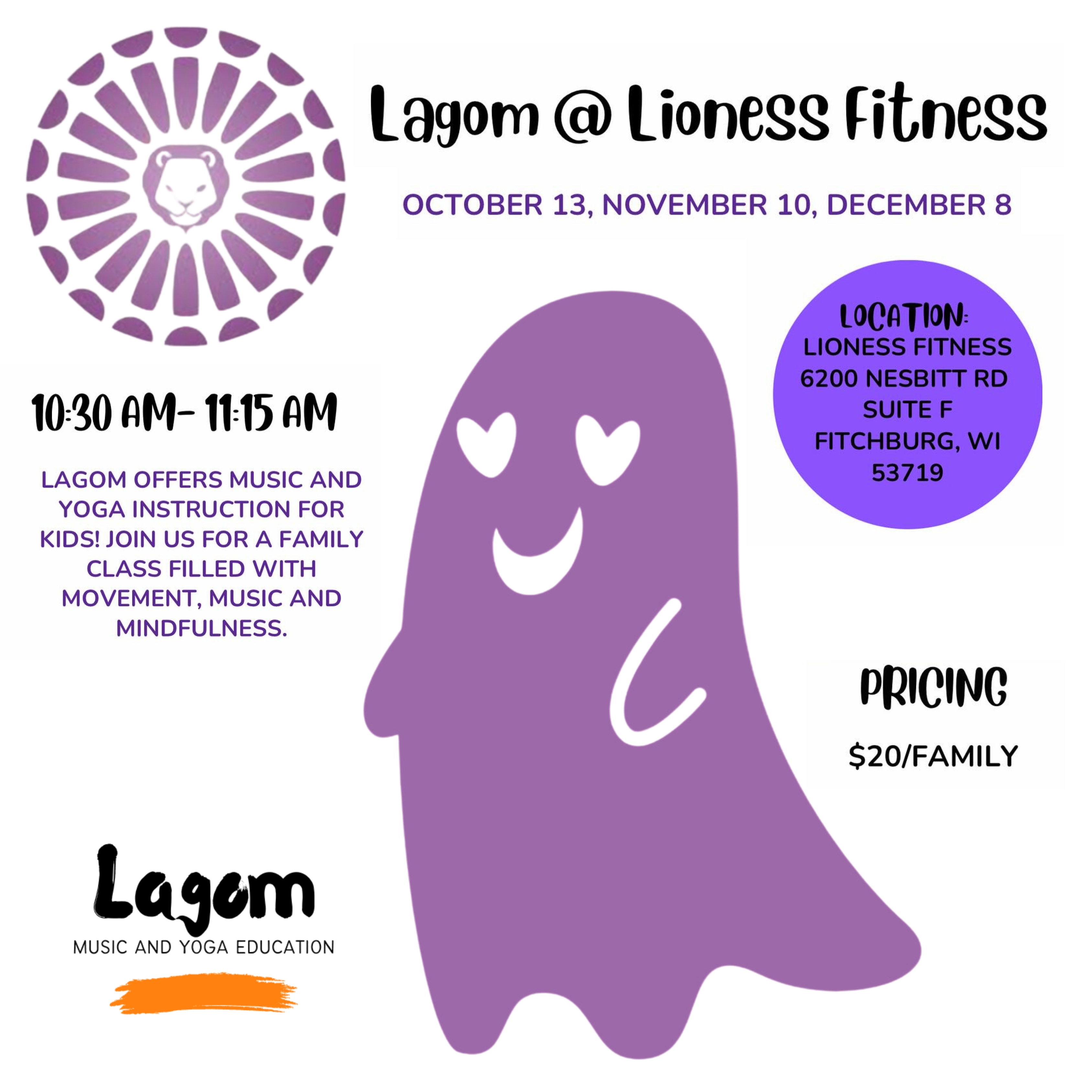 - Sunday, Oct. 13: Lagom Yoga and Music Class, Lioness Fitness, Fitchburg