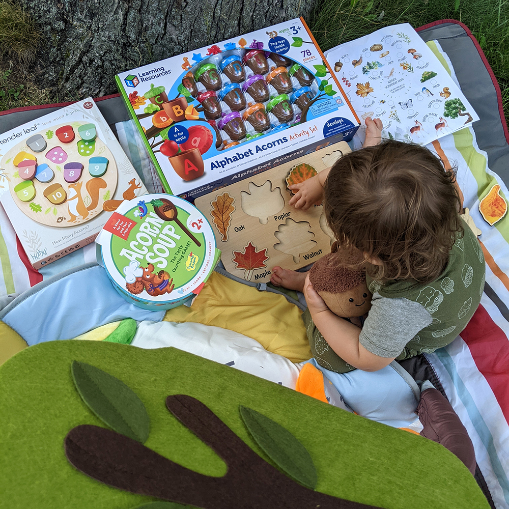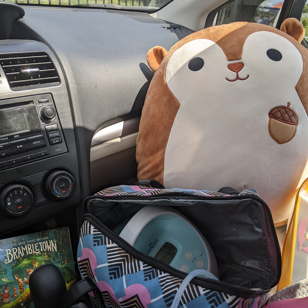 My copilot for the day while Z was at daycare was Sawyer the (Squishmallow) Squirrel. After packing up, we enjoyed listening to the new CD by The Okee Dokee Brothers, who we saw live at the Majestic the previous day for my early birthday celebration. Even though Z's birthday isn't for a few months, she certainly has been enjoying testing all of these acorn-themed games, puzzles, and stuffed animals generously gifted to us by cousin Mandi before they hit the play space. Thank you also to dear friends Julie and Cindy for the outdoor picnic blanket and baby play mat!
