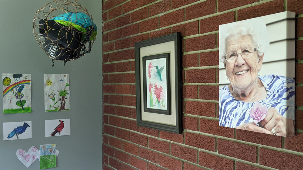 Artwork that adorns our fireplace and dining room, the sunniest spot in our home. From left: drawings made by our nieces, a framed hummingbird painting by Brooklyn, WI watercolor artist Steve Wagner that I had gifted my grandma, and my favorite photo of Oma that I took at her house where we often saw cardinals and hummingbirds.