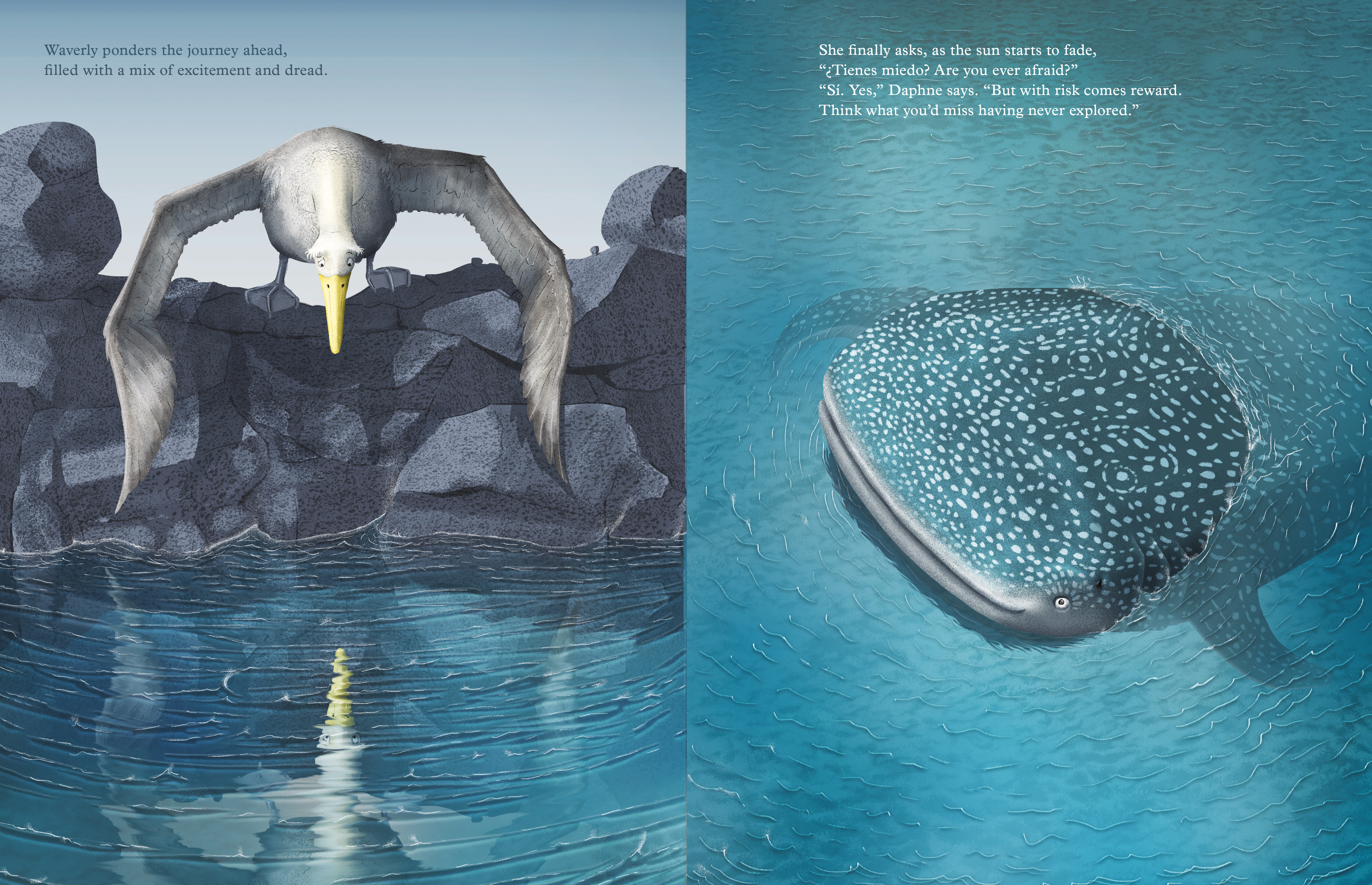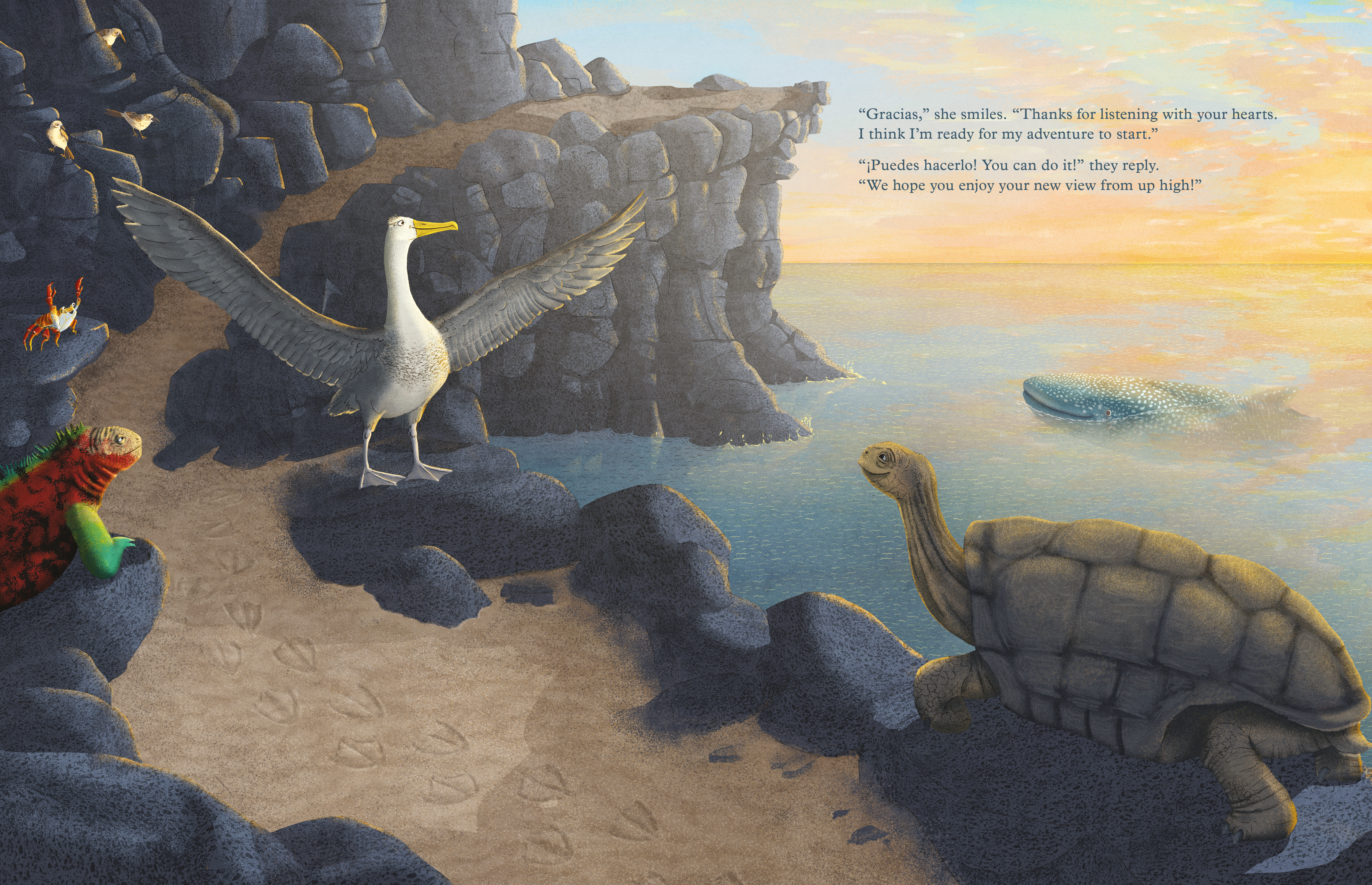 Perhaps that memory was hidden in my subconscious when I wrote the scene in my book with other creatures on the island, including Sal the saddleback tortoise and Daphne the whale shark, encouraging Waverly the albatross to fly by cheering, “¡Puedes hacerlo! You can do it!” (page 24). Humans and anthropomorphized animals all wanted this bird to succeed.