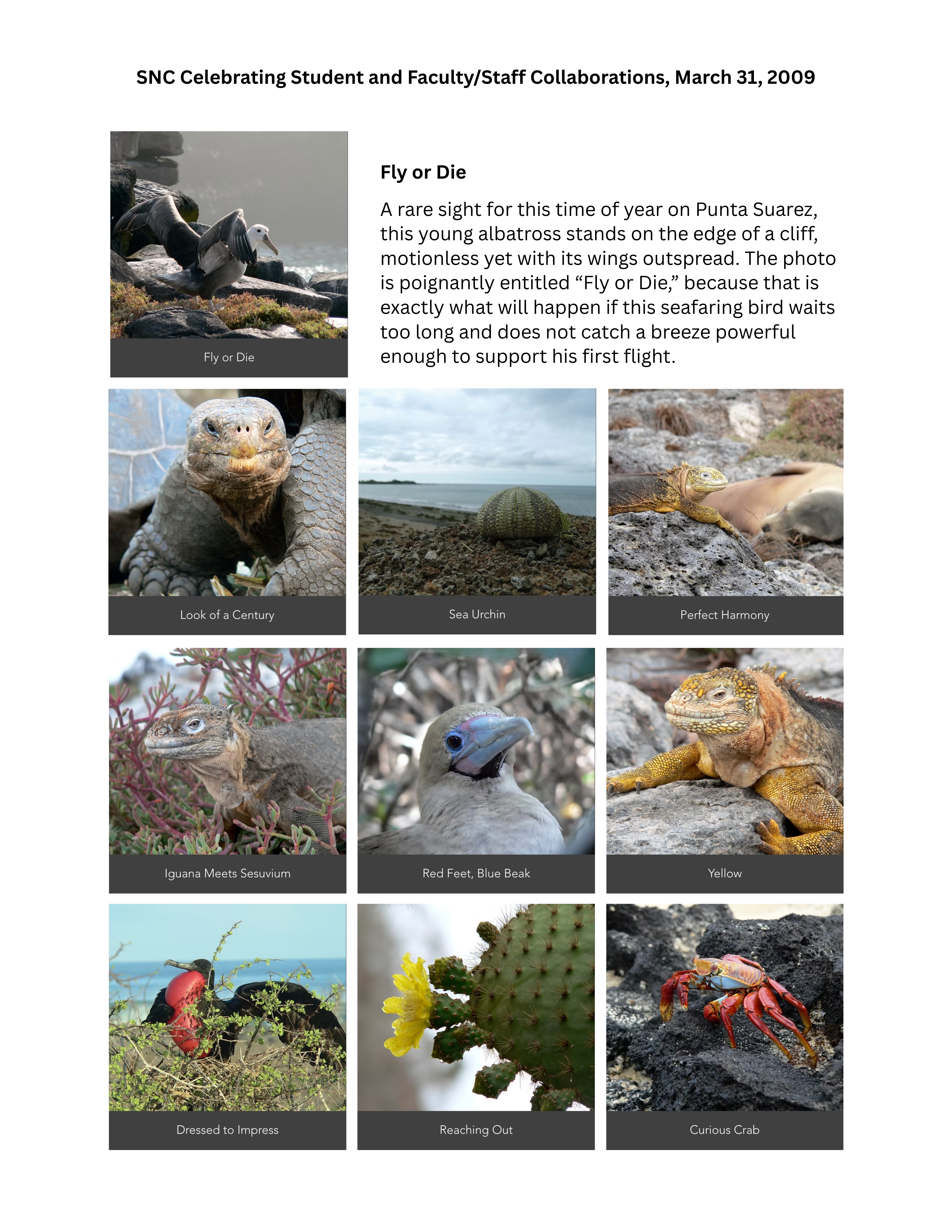 To my delight, Dr. Flood had saved the enlarged matted prints I took of the island flora and fauna as the trip photojournalist, and he invited me to join him in an extemporaneous presentation featuring the photos, slides, and videos our class had co-created over 15 years ago. We had previously collaborated to share our experiences on campus and through the St. Norbert Times and SNC Magazine in spring 2009 to celebrate the Year of Darwin, which marked the 200th anniversary of the birth of Charles Darwin as well as the 150th year of the publication of his influential book, “The Origin of Species.”
