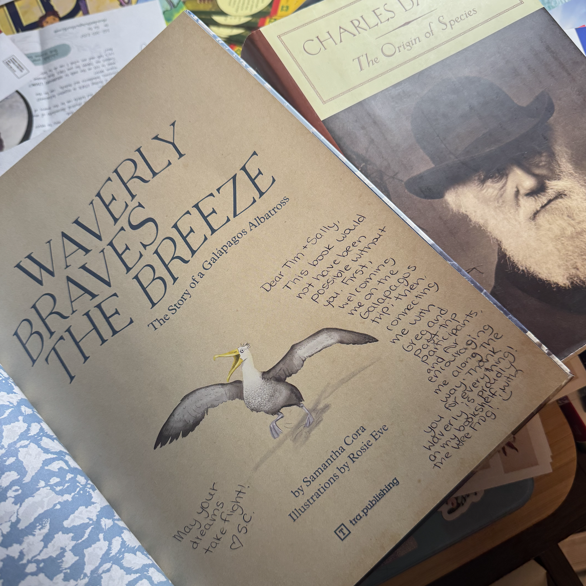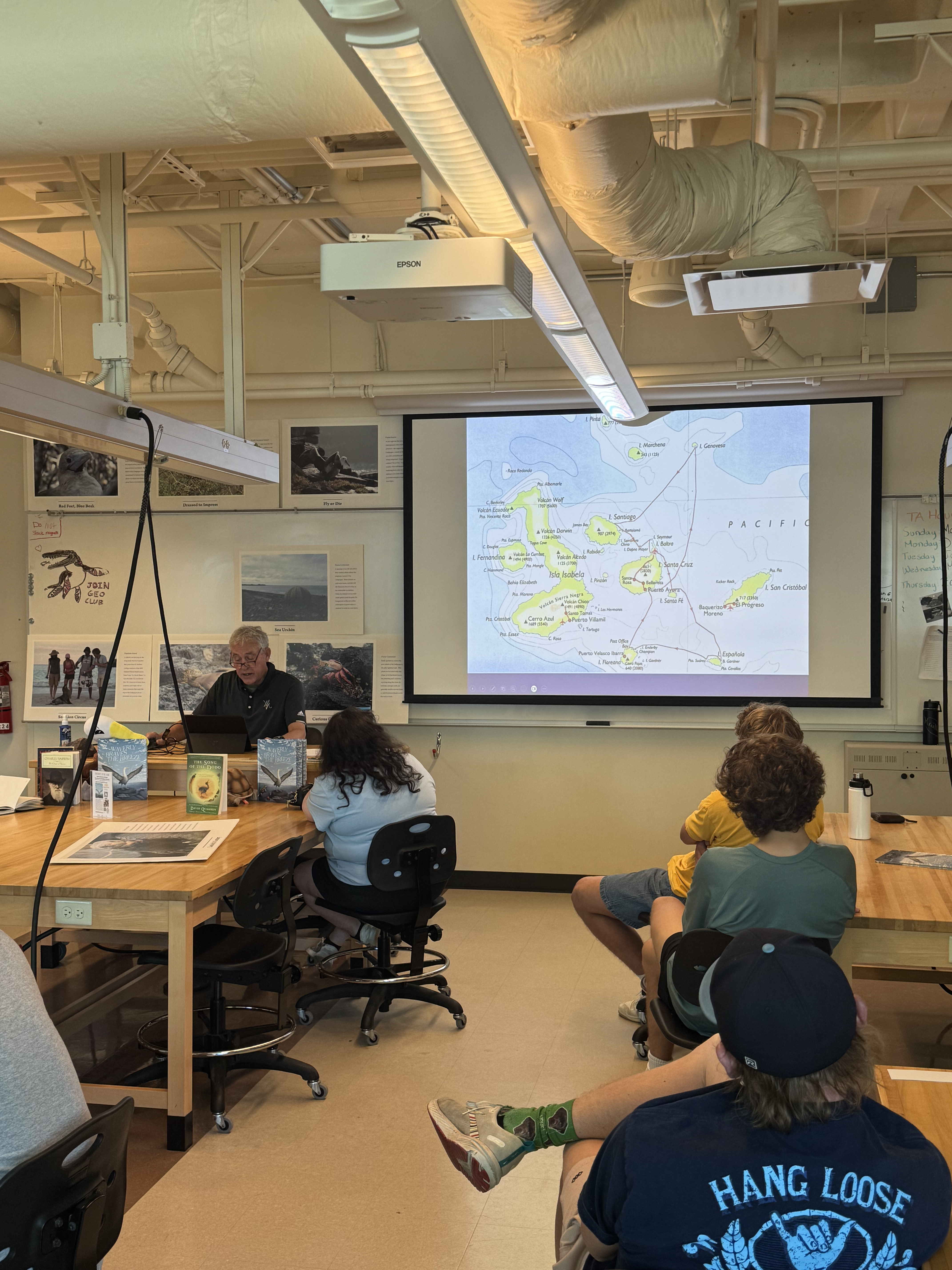 It was wonderful to revisit the trip through Dr. Flood’s lens (and occasional dry humor) as he pointed out lava rocks, animal facts, and trip moments that I had forgotten, including details about the last waved albatross to migrate from Española Island that inspired my book. “For these rascals to fly, in their first flight they have to jump off a cliff (about 100 meters high). And if they don’t fly, they’re fish food. And so we sat there for an hour going, ‘Go! Go!’” he recalled in a hushed tone.