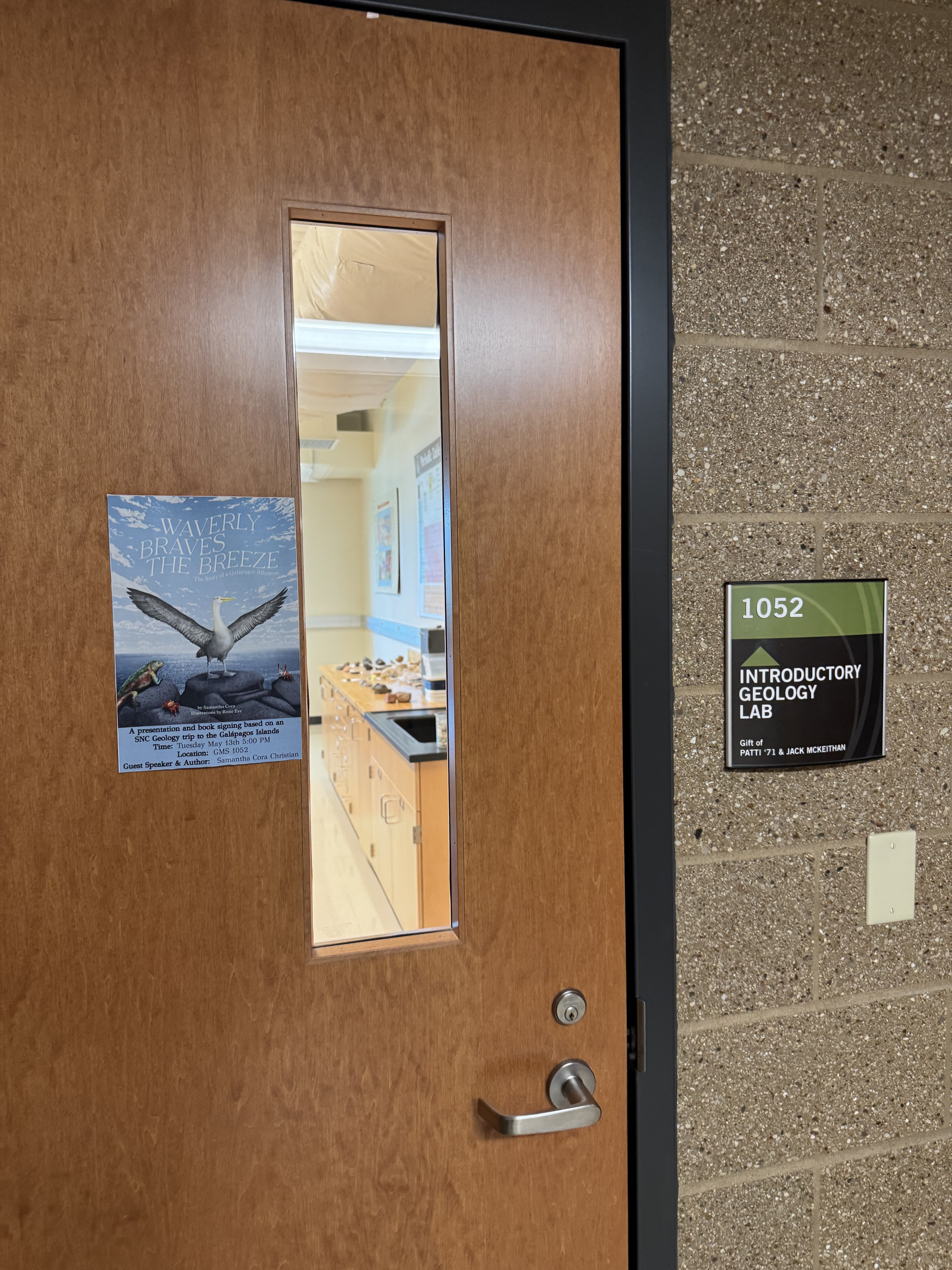 As I entered a new-to-me science center and approached room 1052 – Introductory Geology Lab, it was surreal and bittersweet to see a flier of my recently published children’s picture book posted on the door. Not every student would opt to sign up for a lecture at 5 p.m. during finals week, but a dozen SNC undergrads representing a mix of majors – from the sciences to communications – filtered in one by one to hear from their professor in his classroom for the last time, and from me for the first and likely only time.